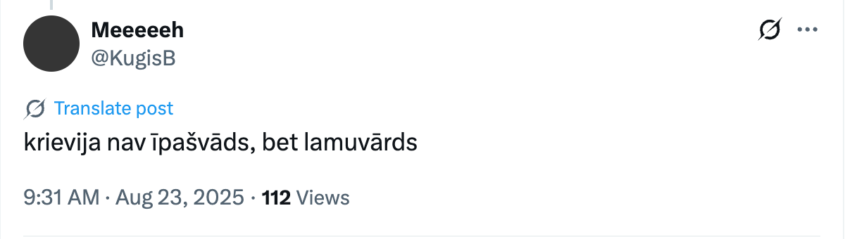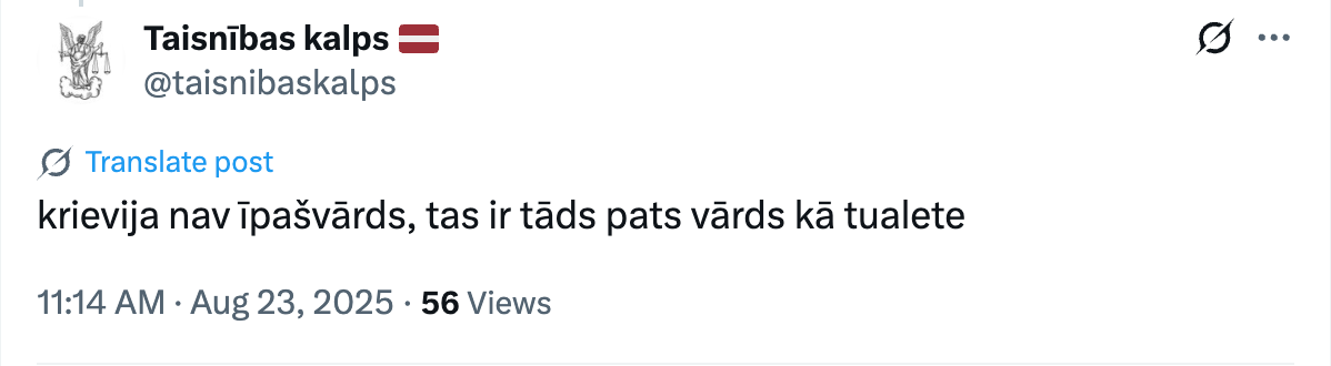 Kā sauc valsti, kas pārvalda to teritoriju uz austrumiem no Zilupes, kas ir iebrukusi Ukrainā, un kas, saskaņā ar NBS tvītā lasāmo, izplata dezinformāciju par Latviju? To sauc par Krieviju. Latviešu valodā pat notiesātu slepkavu vārdus un uzvārdus raksta ar lielo sākumburtu. Un ne jau aiz cieņas pret viņiem vai viņu pastrādātajiem briesmu darbiem. Bet aiz cieņas pret savu valodu. Tas, ko aizstāv tie, kas raksta īpašvārdu “Krievija” ar mazo sākumburtu, nav ierakstīts mūsu Satversmē. Tas ir kaut kas cits.