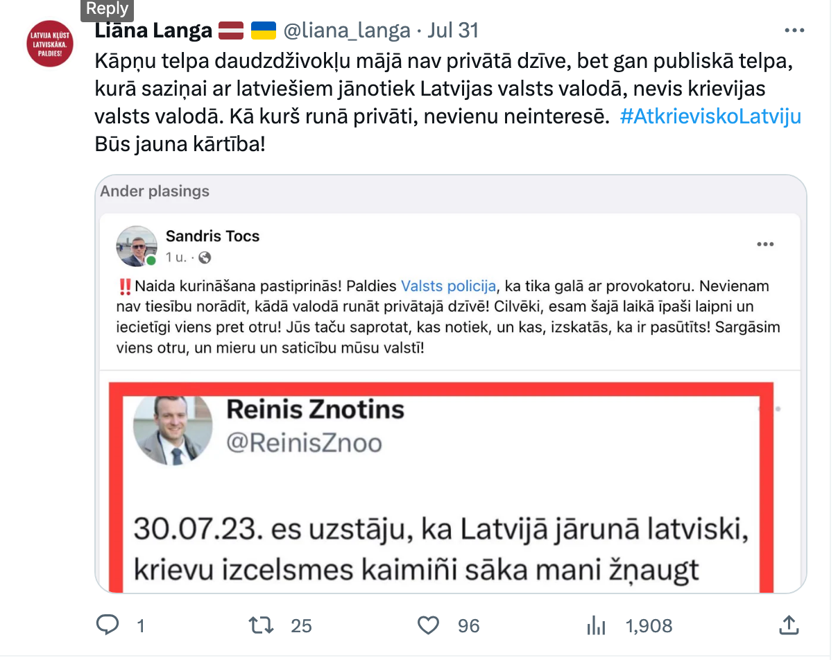 Znotiņa apgalvojums, ka kaimiņam ir viņš jāklausās, sasaucas ar Liānas Langas tviterī teikto šī notikuma sakarā. Pēc tam, kad kāpņu telpu viņa ir pārdēvējusi par publisko telpu, kurā pilsoņiem ir dotas policejiskas tiesības regulēt privātās saziņas valodu, viņa postulē: "Būs jauna kārtība!" Liāna Langa, par kuras ekstrēmismu ir jau vairākkārt rakstīts, pāris reizes pavairo Znotiņa stāstu, turklāt to izdaiļojot ar aplamām, tribālistiskām atziņām.