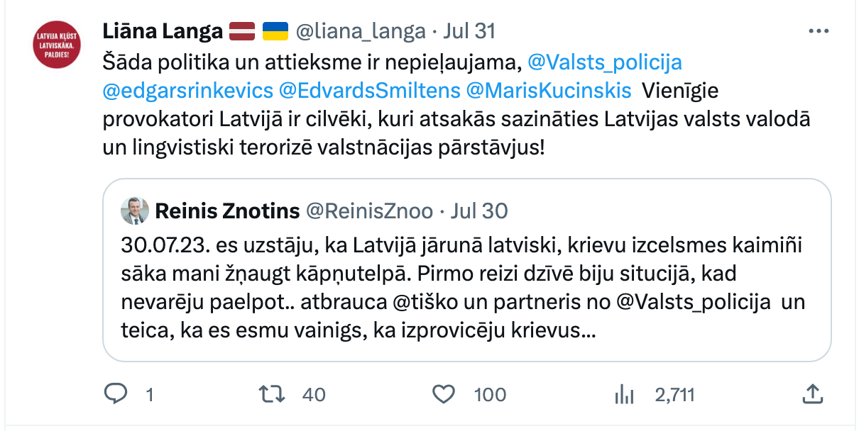 Kā iedzērušais eksdeputāts to pierādīja ar savu 30. jūlija vakara tvītu, Liānai Langai nav taisnība.