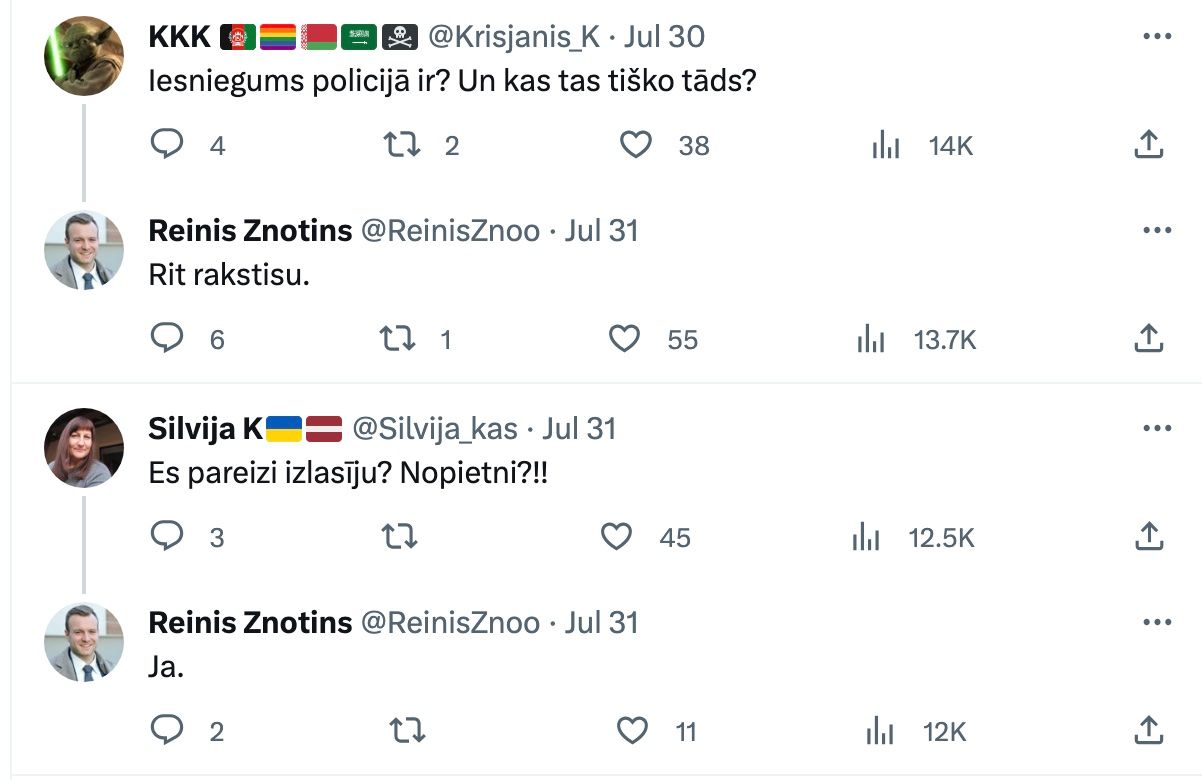 Vēl pāris īsi tvīti, kuros Znotiņš apstiprina, ka notikumu pārstāsts ir domāts nopietni, ir tapuši uzreiz pēc pusnakts, tātad joprojām dzērumā. Lai arī alkohola reibums neatbrīvo no atbildības, vairāk par bijušā politiķa godaprātu runā nevis šie paši dzērumtvīti, bet ilgais klusums pēc šo apsūdzību izskanēšanas plašā mērogā. Līdz video uzpeldēšanai 2. augusta vakarā Znotiņa vienīgais publiskais paziņojums ir šis, kas parādās divas diennaktis pēc notikušā, 1. augusta vakarā:
