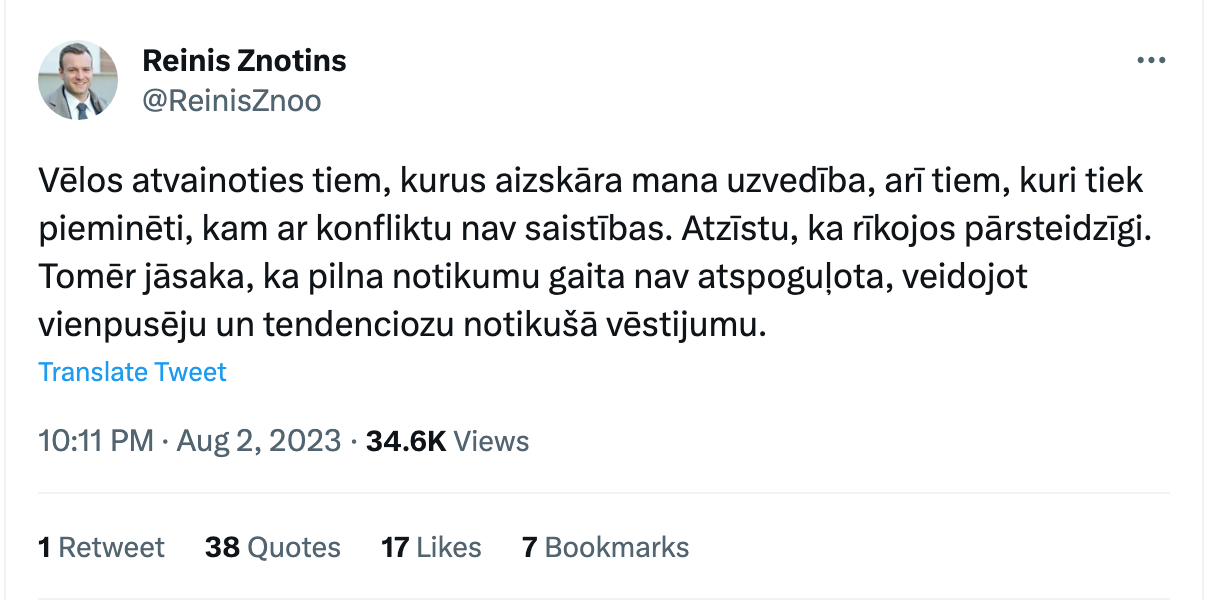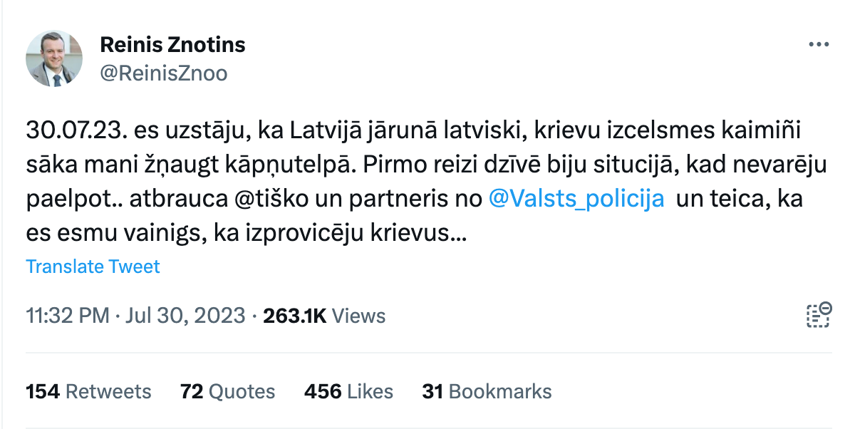 Ne velti šeit pieminu kampaņas "Atkrievisko Latviju" seju, kuras pūliņus valsts valodas lietojuma stiprināšanā nesen publiski atzīmēja arī tābrīža Valsts prezidents Egils Levits. Viņa izmantoja Znotiņa aizdomīgo tvītu, lai turpinātu ar apšaubāmām metodēm popularizēt savu kampaņu, kuras mērķis (stiprināt valsts valodas pozīcijas) pats par sevi ir atbalstāms. Taču izmantotā retorika tāda galīgi nav.
